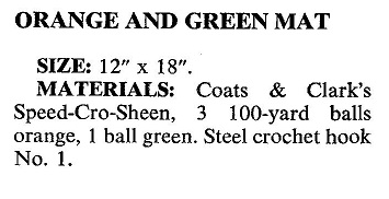Orange and Green place mat of heavy cotton is crocheted in a unique way - a row of shells from half-disks from bottom to top of mat, then shells complete the little circles from top to bottom. Working from one side of mat to the other, the joined disks form the pattern.